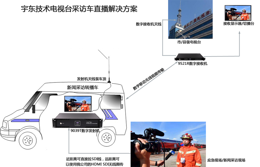 廣播 電視臺(tái)現(xiàn)場(chǎng)采訪車無(wú)線視頻信號(hào)遠(yuǎn)距離傳輸,直接在車上安裝車載無(wú)線圖傳系統(tǒng),配合車載播出系統(tǒng)切換系統(tǒng),能實(shí)時(shí)將多路攝像頭信號(hào),任意切換后通過(guò)無(wú)線發(fā)射,直接在電視臺(tái)播出機(jī)房接收到現(xiàn)場(chǎng)信號(hào),再通過(guò)光纖鏈路,傳輸?shù)诫娨暟l(fā)射塔,通過(guò)開(kāi)路電視發(fā)射出去,也可以通過(guò)有線電視線路傳輸。指揮中心或者老百姓就可以通過(guò)足不出戶,看到活動(dòng)場(chǎng)面的實(shí)時(shí)畫(huà)面。