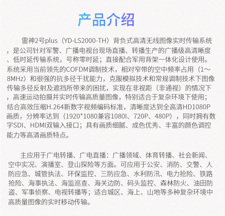 主應用于廣電轉播、廣電直播:廣播領域、體育轉播、社會新聞、空中實況、演播室、登山探險等方面。可應用于公安、消防、交警、人防應急、城管執法、環保監控、三防應急、水利防汛、電力搶險、鐵路搶險、海事執法、海監巡查、海關邊防、碼頭監控、森林防火、油田防盜、軍事偵察、電視轉播等;適合城區、海上、山地等多種復雜環境中高質量圖像的實時移動傳輸。