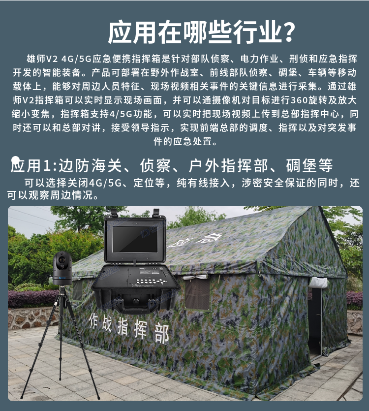 雄師V2 4/5G高清應急便攜指揮箱是一款功能全面、攜帶方便的無線視頻指揮一體化產品,超高設備集成度,內置高性能鋰電池組,具備防水防震等特性的應急指揮箱,可滿足臨時布控和快速安裝的特殊要求。執(zhí)行任務時可快速將設備臨時安放在需要監(jiān)控的位置或直接吸附在車輛上,任務結束時可方便將設備拆下,適用于外勤執(zhí)法、偵查布控、安防安保、應急指揮、搶險搶修、巡線管理等行業(yè)應用,比如公安、交警、消防、路政、城管、交通、法院、監(jiān)獄、林業(yè)、電力、水利、環(huán)保等單位。為用戶提供高清、流暢、穩(wěn)定的視頻效果,能實現北斗定位、遠程視頻查看、雙向語音對講、錄像保存回看等功能。“聽得到、看得見”是針對突發(fā)緊急事件的一整套應急指揮設備,為實現應急指揮的“通信暢通、現場及時、數據完備、指揮到位”提供技術保障,可廣泛應用于應急指揮、公安、刑偵、交巡警、消防、部隊、人防應急、邊防、城管、電力、路政等領域。